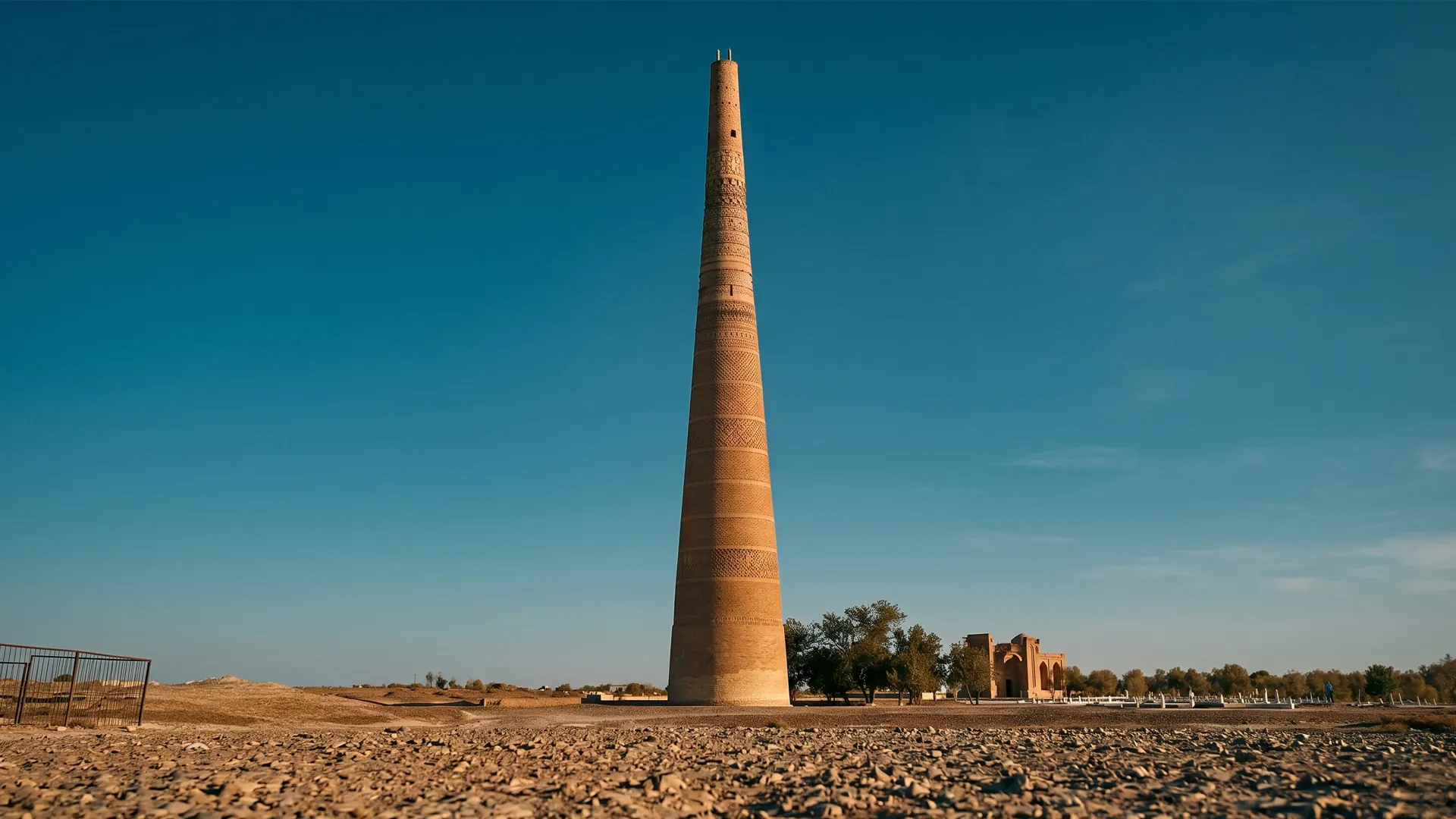 높이 약 60미터의 쿠틀루그-티무르 미나렛은 중앙아시아에 현존하는 가장 높은 미나렛 중 하나로, 14세기 초 쿠냐-우르겐치에 건립된 호라즘 건축의 상징입니다. 수백 년의 지진과 풍화를 견뎌온 이 벽돌 탑은 중세 이슬람 공학의 경이를 오늘날에도 생생하게 전합니다.