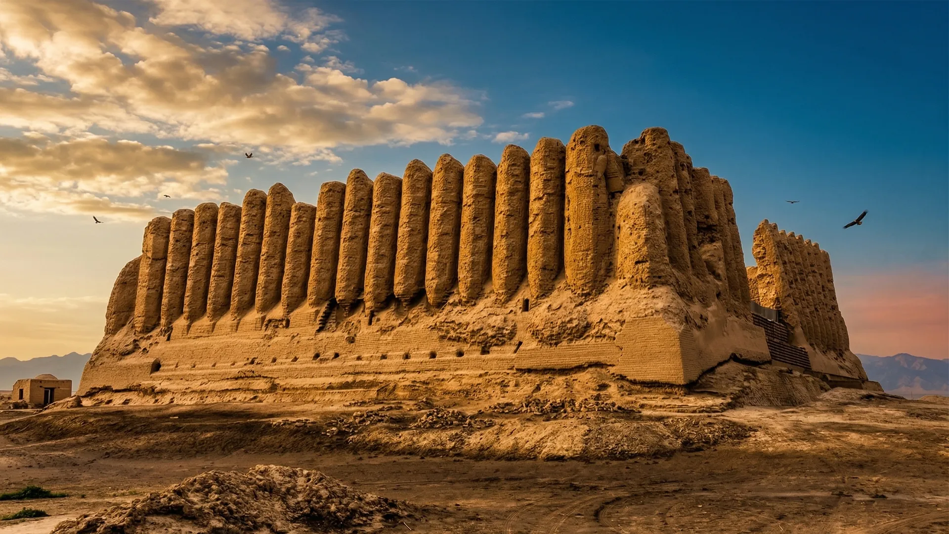 고대 메르브에 있는 쌍둥이 초기 중세 성채로, 극적으로 주름진 진흙 벽돌 담장이 실크로드 시대에서 살아남은 가장 시각적으로 독특한 유적 중 하나입니다.